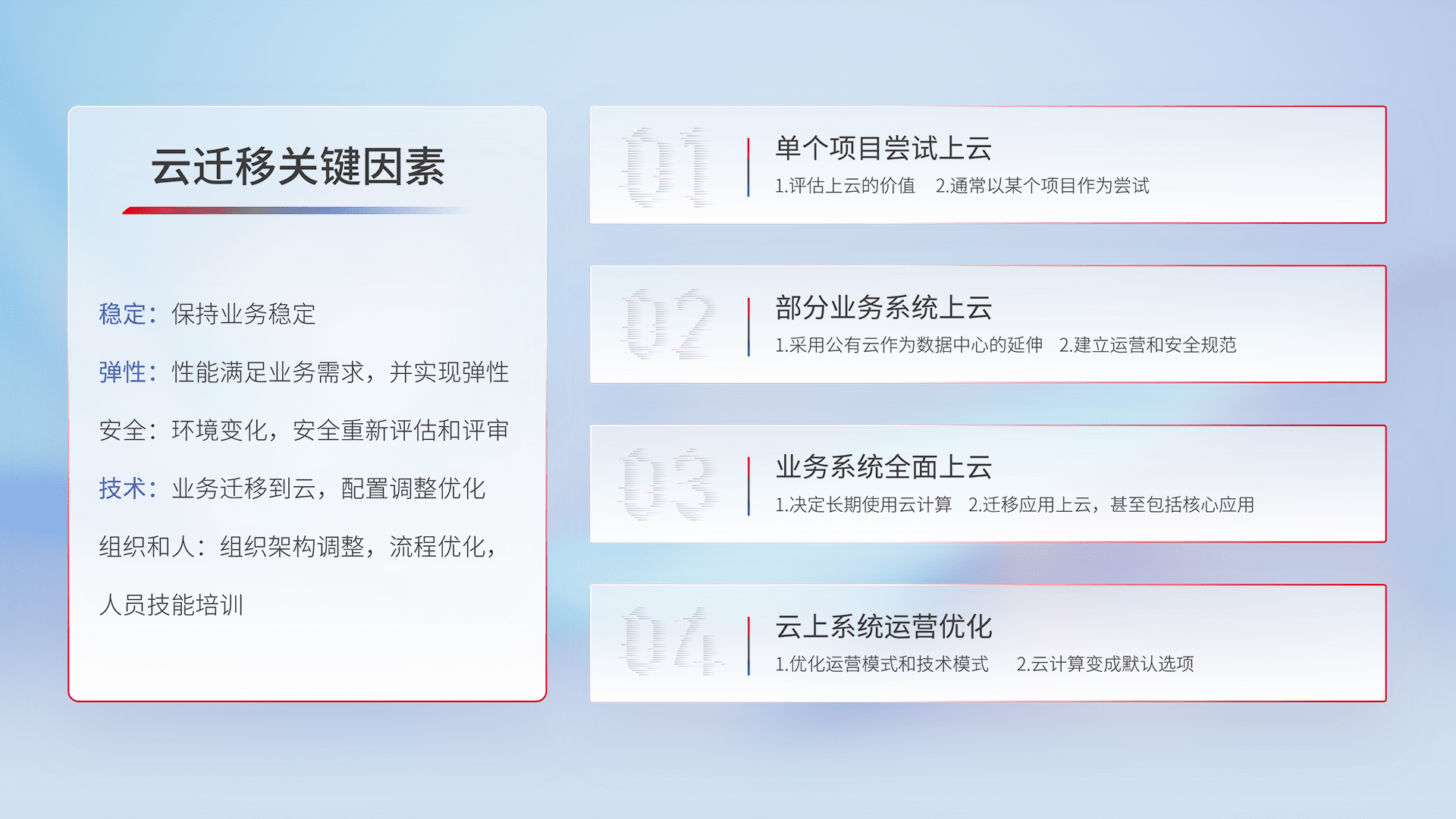 结合实际业务,,从规划设计、、云平台选型、、、云原生改造、、、、数据迁移、、集成交付,,,迁移全过程为客户识别最佳上云路径,,,做好风险识别管理,,,设计网络架构、、、身份权限、、、安全审计合规、、操作审计、、、、日志审计、、、、监控告警策略、、多站点容灾设计等,,,对云上基础设施进行整体规划,,,,提升IT治理水平,,以满足弹性、、、高可用、、、高性能的需求。。