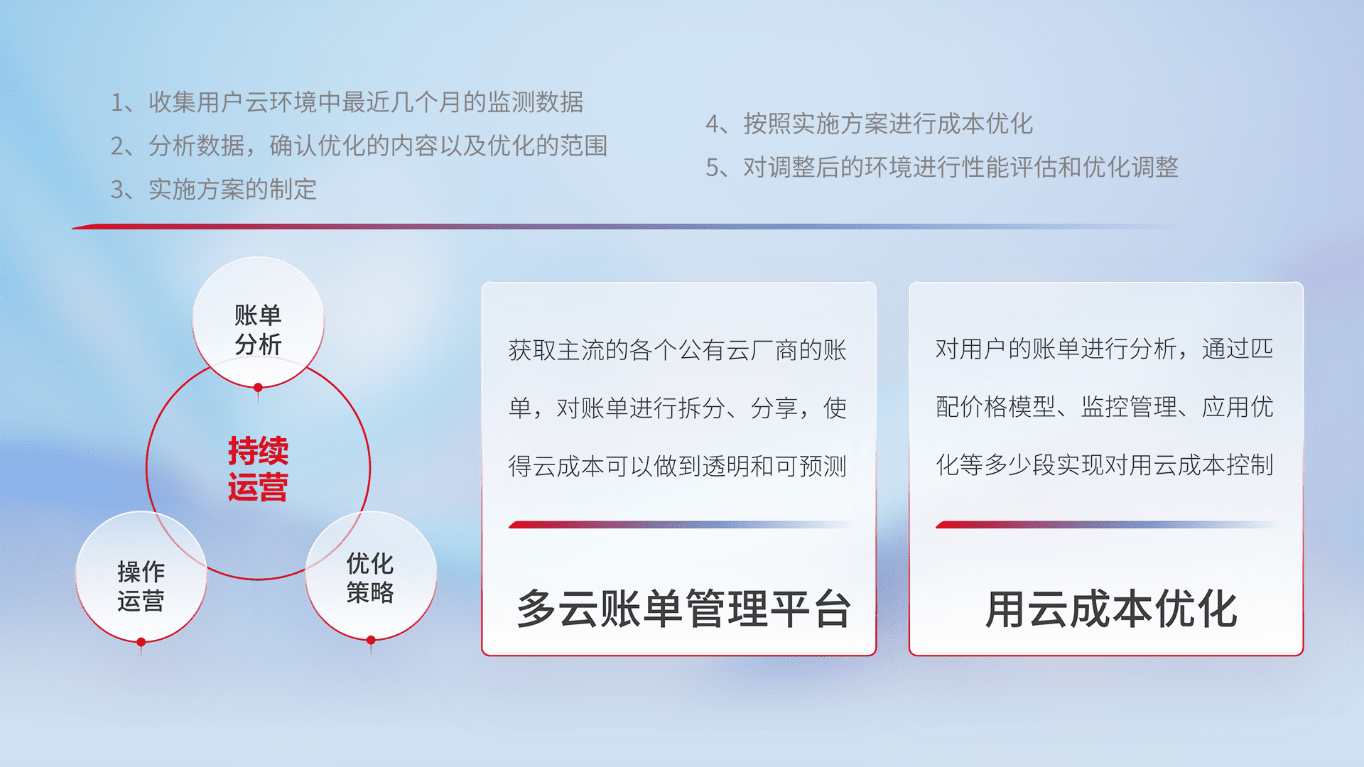 通过多云纳管,,以统一的资源数据模型把客户的云资源进行抽象和封装,,进而实现对多云资源的统一操作,,,,保障云资源管理的可靠性、、、、稳定性与可用性。。。。量身定制化运维内容,,配置、、开发运维、、补丁管理、、、备份、、、、监控、、认证和访问管理、、审计和日常巡检等,,,保障在用云过程中的可靠度,,稳定度以及高可用率。。。