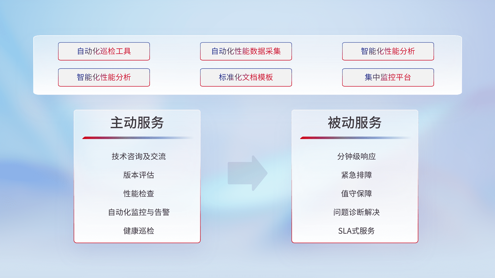智能化工具和标准化文档,,,保障服务质量,,,提供主动服务(包含技术咨询、、、版本评估、、性能检查、、、、自动化监控与告警、、健康巡检)和被动服务包含(分钟级响应、、紧急排障、、、值守保障、、、、问题诊断解决、、SLA服务)。。。。